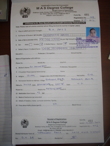 1st Admission Form of Ms. Yashmeen Bano for B. A. 1st Year (13th of June, 2011) |